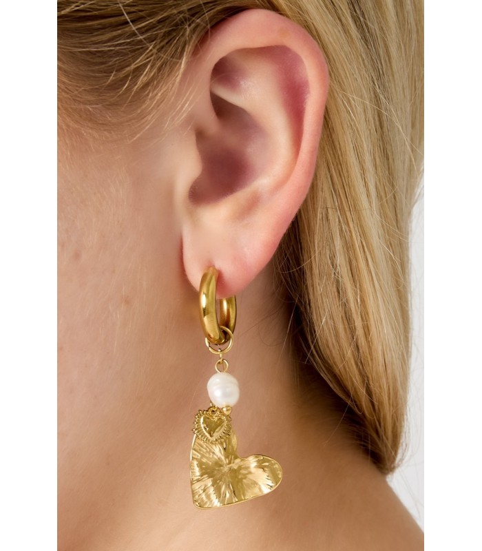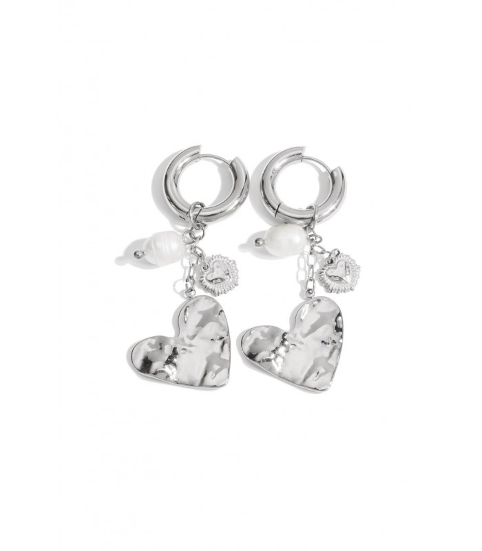 Hoe combineer je gedurfd met romantiek? Deze zilverkleurige oorbel doet precies dat. De glanzende hartvormige hanger heeft een gehamerde finish, aangevuld met een speelse witte kraal en een extra hart charm. Perfect voor wie houdt van opvallende oorbellen met karakter. Trendy en tijdloos Deze oorbellen geven je look een moderne touch zonder te overdrijven. Ideaal bij een casual outfit of als statement bij een minimalistische avondlook. Een must have voor liefhebbers van zilveren sieraden en unieke hart oorbellen.