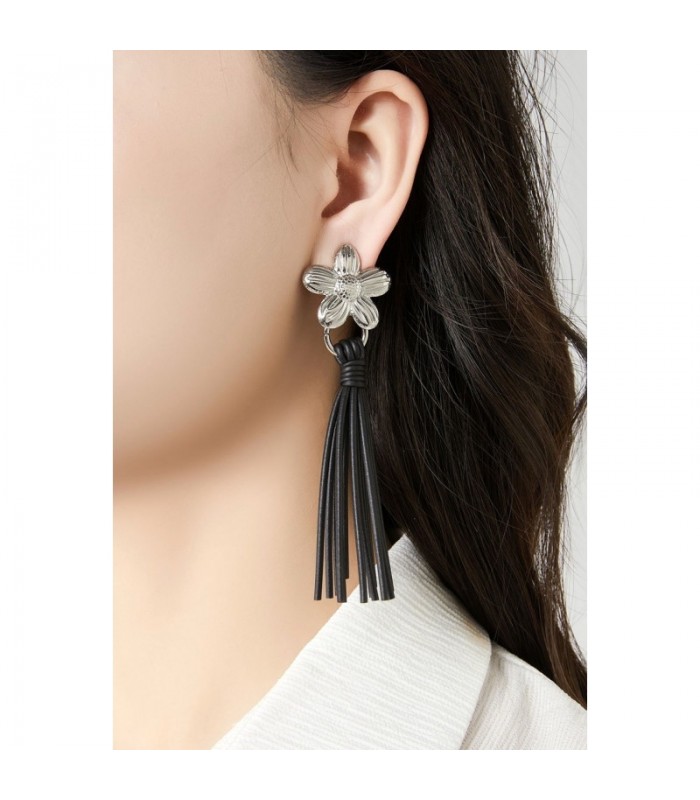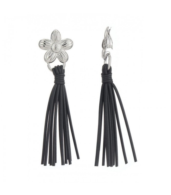 Oorclips met zilverkleurige bloem en lange zwarte rubberen strengen
