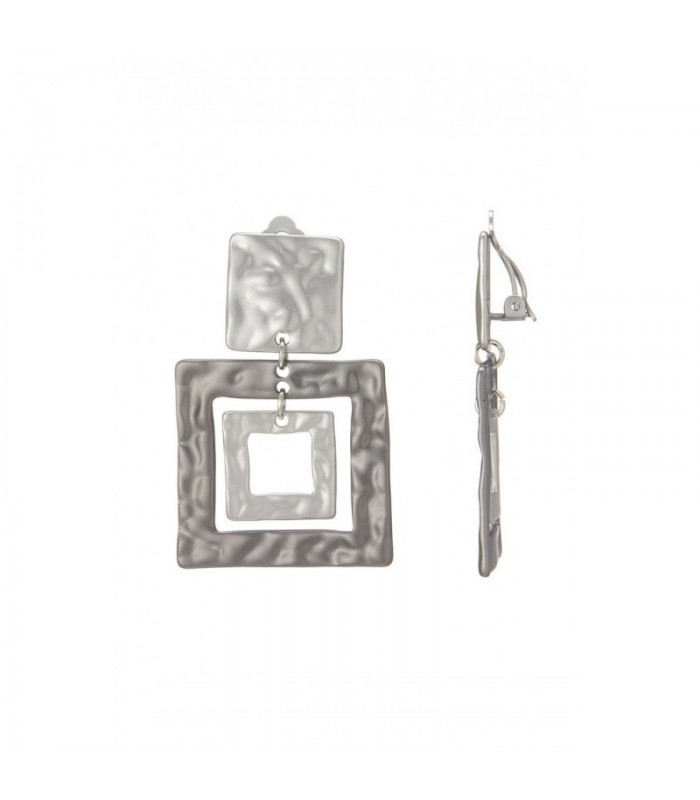 Wil je opvallen met een geometrische blikvanger? Deze zilverkleurige oorclips bestaan uit drie vierkante elementen in een speels, open ontwerp. De gehamerde afwerking geeft het strakke lijnenspel een organische textuur, waardoor de oorclips zowel modern als uniek aanvoelen. Perfect bij een monochrome outfit of als contrast bij een kleurrijke look.