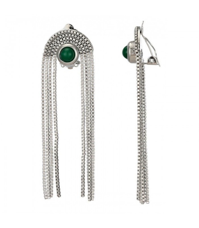 Oorclip met lange zilverkleurige kettingen en een groen steentje