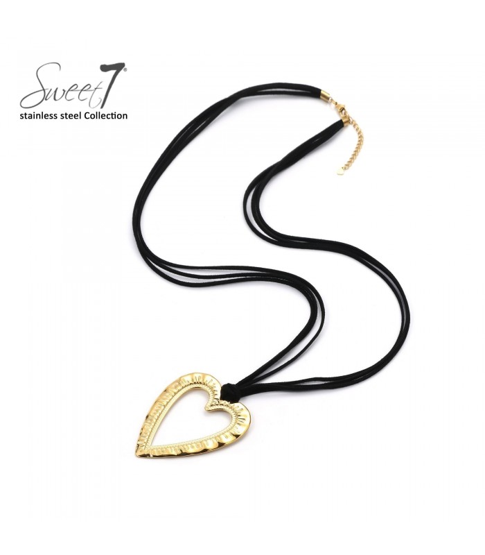 Hoe geef je een casual outfit direct karakter? Deze halsketting van Sweet7 combineert een opengewerkt hart in goudkleurig stainless steel met een zwart, koord. De asymmetrische hartvorm geeft een speelse twist, terwijl de textuur in het metaal zorgt voor een eigentijdse uitstraling. Minimalistisch, maar met impact. Licht en veelzijdig De verstelbare sluiting maakt deze halsketting geschikt voor elke halslijn. Draag m solo voor een subtiel statement of met andere kettingen. Populaire zoektermen als gouden ketting dames en zwarte koord ketting sluiten naadloos aan op dit trendy ontwerp.